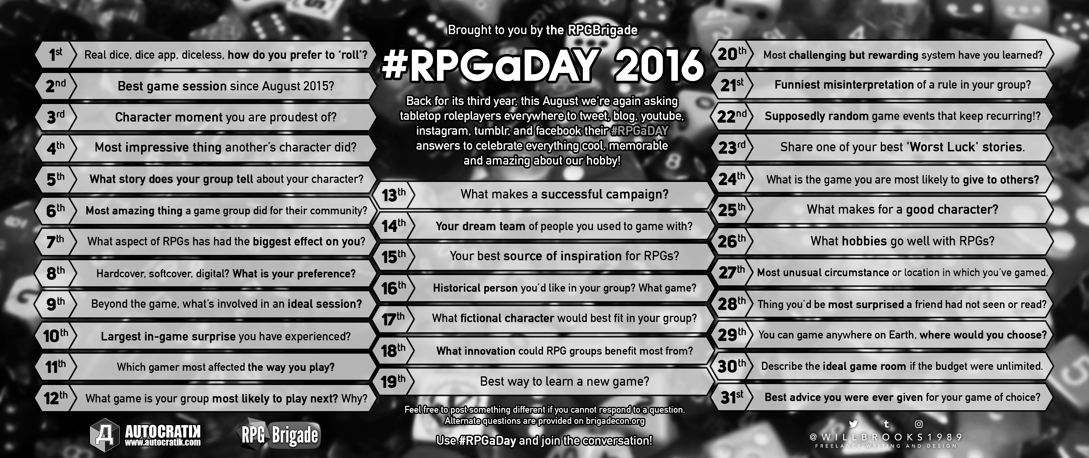 Some of the questions may be challenging, or may require more or different experience with gaming than you currently have. Don’t worry, alternate questions are available on BrigadeCon.org for those times when you get stuck with no answer for a question. I think I will have to dip into that well once or twice during the run of RPGaDay 2016, so don’t worry about it if you do. Some of the alternates just might be cooler than the main questions.