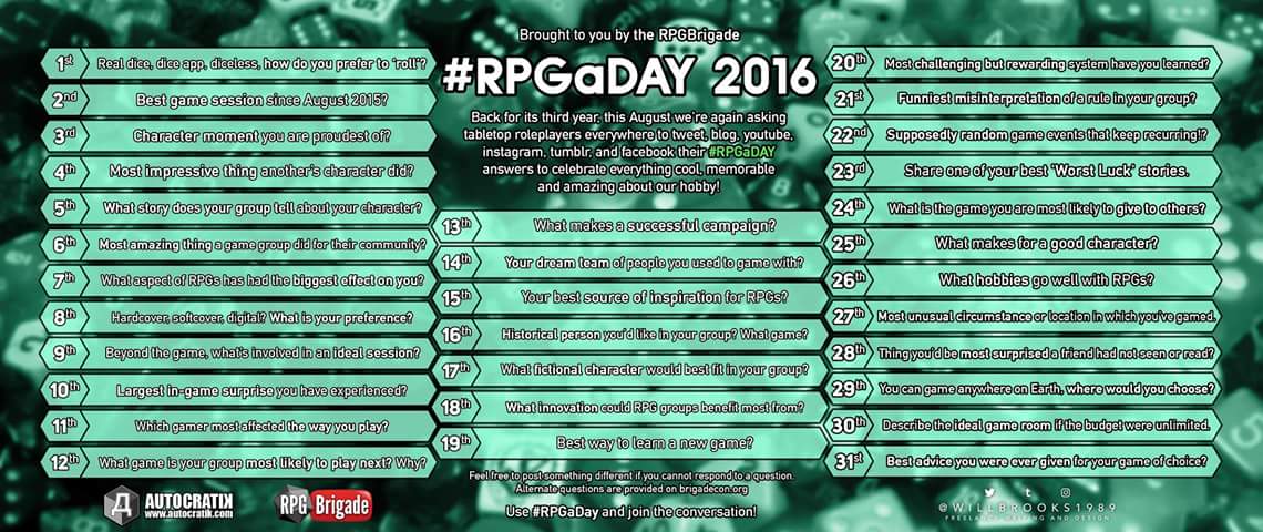 If you are just learning about RPGaDay, you can find out all you need to know here on the Casting Shadows blog, or better yet at BrigadeCon.org.