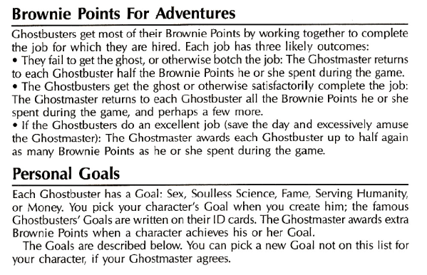 In Ghostbusters, experience points are served up in the form of a Brownie Point replenishment. Of course, the players are hoping to be able to amass enough of them to improve their characters, but in practice that would mean not spending them during play to save their butts.