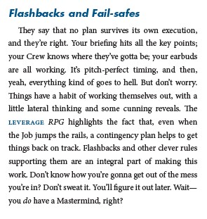 In this popular style of play, the GM and players run through a fast pitch to establish the framework of the situation they are in, and any planning that occurs is intended to be broad strokes not details. In play, as the dice and the NPCs get a chance to interact with player decisions through their characters, then we get to flashback to the planning and preparation that we are imagining took place. This has an advantage for speed and efficiency of play as only the contingencies that actually matter need to have time devoted to them, and they are developed and rolled for with a specific context that helps the player feel the professionalism of their character. In other media, we can tie this method to the aforementioned Leverage, but also to its predecessor Mission Impossible, and certain episodes in certain seasons of Sherlock.