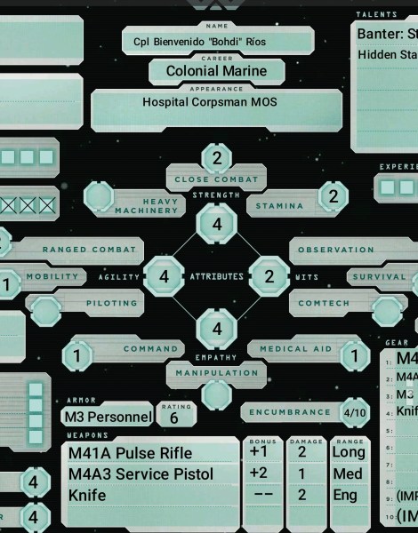 Let’s take a look at an example character before we close out this entry. The indefatigable Eloy “Umbramancer” Cintron has created Corporal Bienvenido Rios as his primary marine for our troupe. When we look at his attributes and skills, we get a sense of what situations this character will feel useful in. His MOS was Hospital Corpsman, but now he serves mainly as Squad Leader. His sharpest skills at the moment are close and ranged combat and he obviously hits the gym a lot to keep up his fitness (stamina). His medical skills aren’t bad, but it is obvious that he is front-line first and medic second.