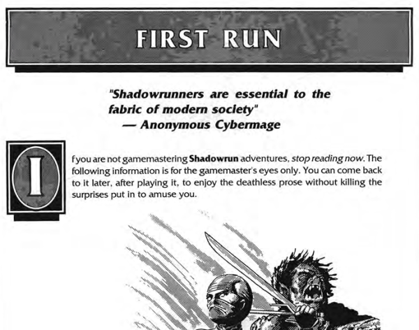 Anyway, we arranged to play in two-week’s time, after he had moved into a better apartment. He was a bit worried about me buying the rules and possibly spoiling the intro he had planned, but he needn’t have worried and he laughed about it – then grew baffled at FASA – as he discovered a few shocks all at once. First, his copy of Shadowrun was now suddenly Shadowrun 1st Edition as mine was 2nd Edition. Second, his copy of Shadowrun 1st Edition was a battered blue softcover, while mine was hardcover – and black. Finally…? The introductory scenario that he felt was so amazing and that I would soon come to agree was amazing, was not in the 2nd Edition rules.
