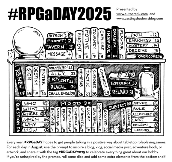 This is the nineteenth day of #RPGaDAY2025 and our prompt today is destiny. I like the idea of destiny, especially as an in-character notion that comes up in conversation in play, that NPCs govern their lives by, that characters wonder about, that conmen and cultists and high school coaches all draw on to get results, regardless of whether a destiny of any sort is affecting play in any way.